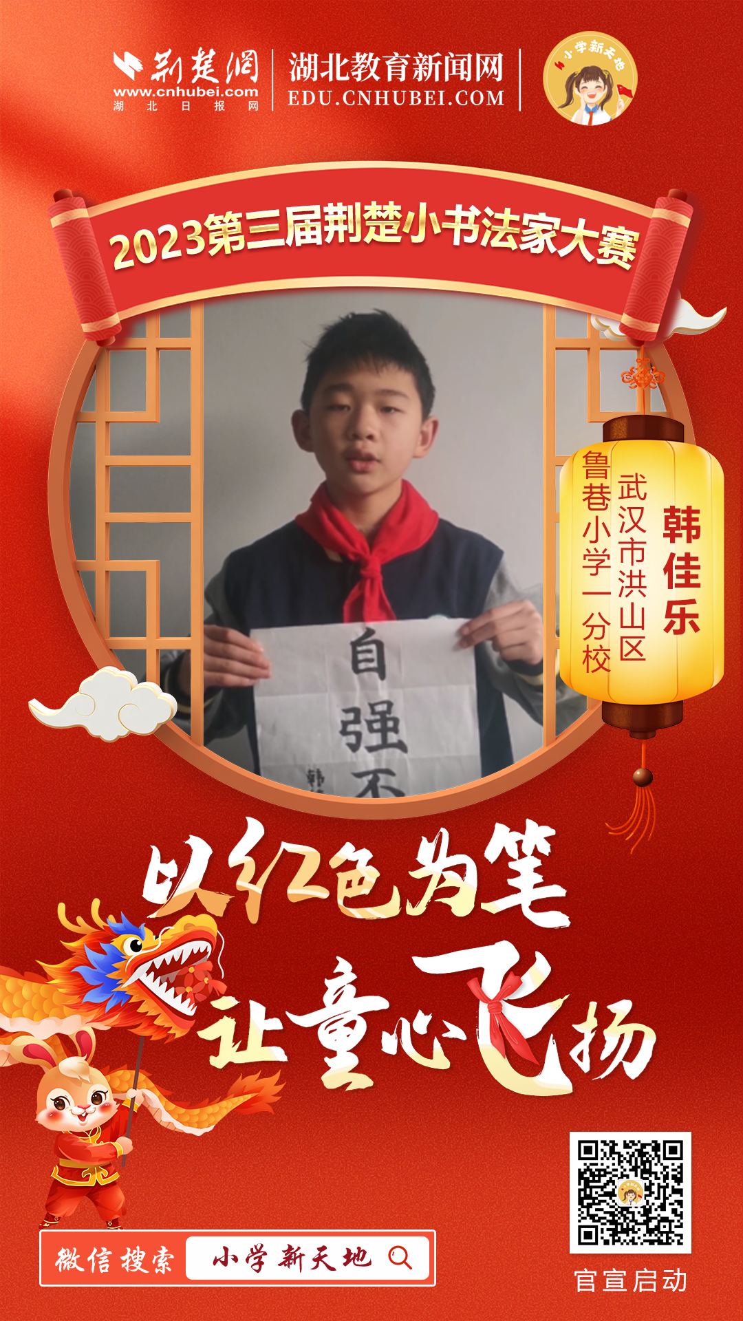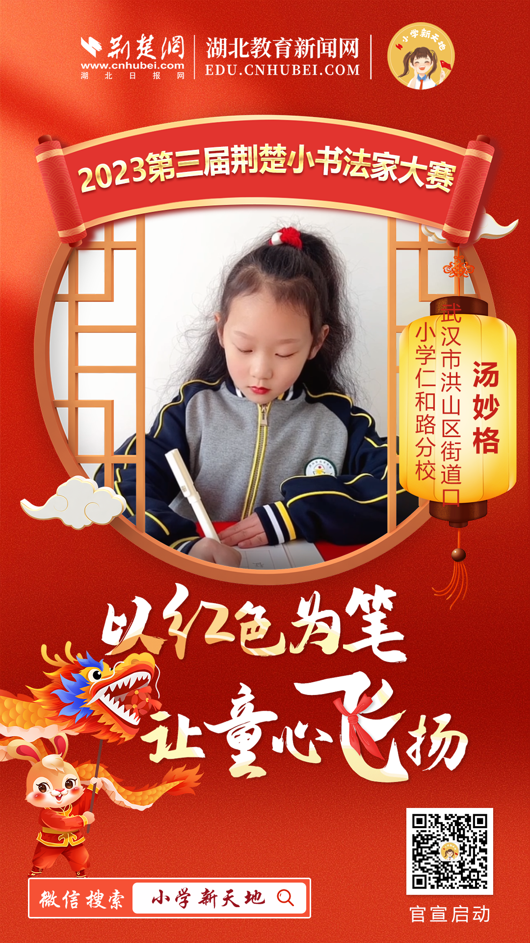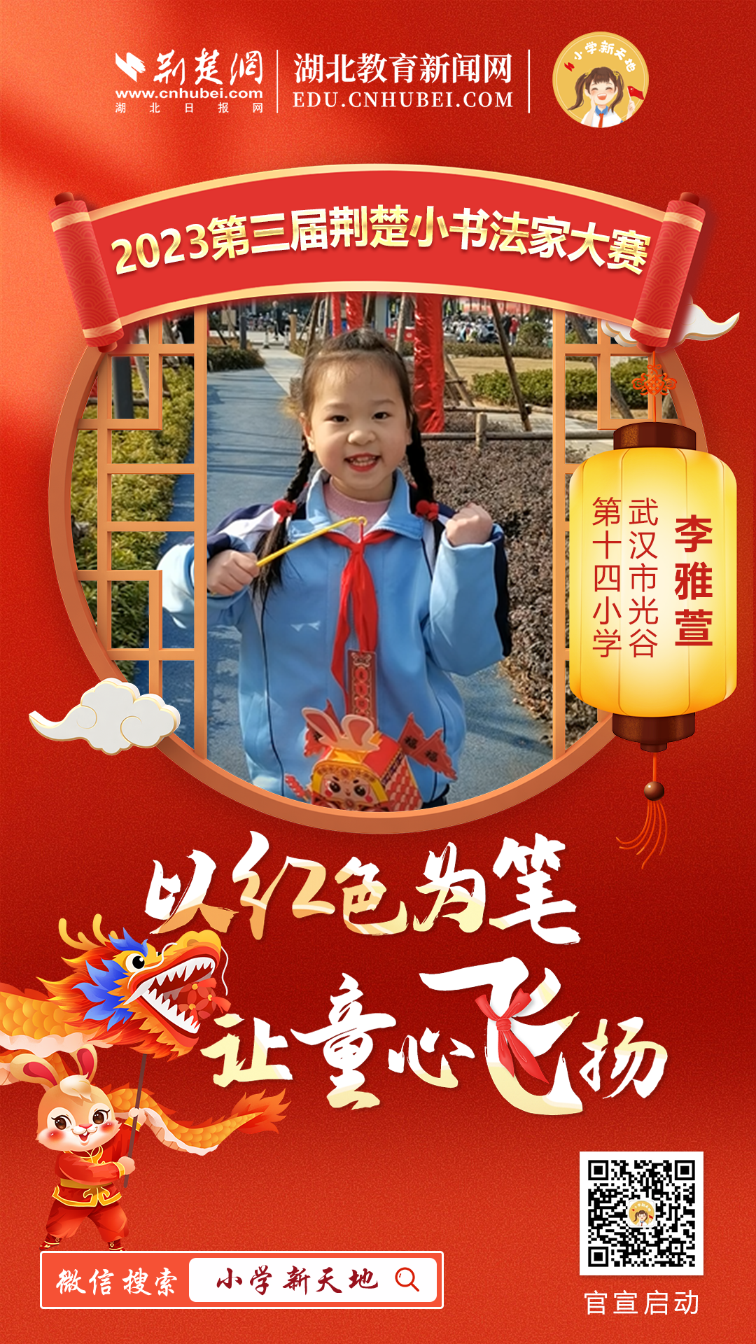 荆楚网(湖北日报网)讯(记者许文秀、何鹏、齐一璇、林杉、唐天琪)以笔之名,书写红色诗词;以诗为媒,传承红色精神。由荆楚网(湖北日报网)、湖北日报传媒集团“小学新天地”教育公众平台共同推出的“以红色为笔 让童心飞扬——‘小学新天地杯’2023第三届荆楚小书法家大赛”大型教育公益活动现已正式启动,有毅力、有审美、爱书法、爱学习的时代少年们快来参赛吧。
