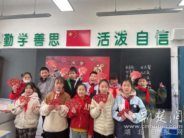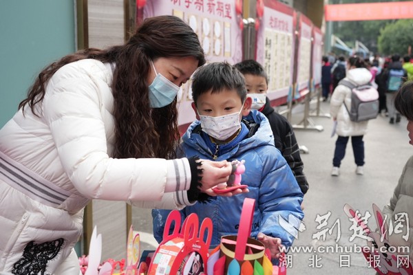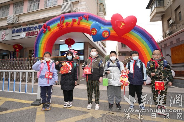 荆楚网(湖北日报网)讯(记者何鹏 通讯员李翠芳、王怡)2月3日,街道口小学校园一片喜气洋洋。该校领导、老师们早早地在学校大门口,热情迎接学生们的到来。假期之初,街道口小学推出了“美兔迎春集五福”2022年寒假学生综合实践活动,让同学们在动脑、动手、动口中体验生活、传承文化,度过一个充实的寒假。