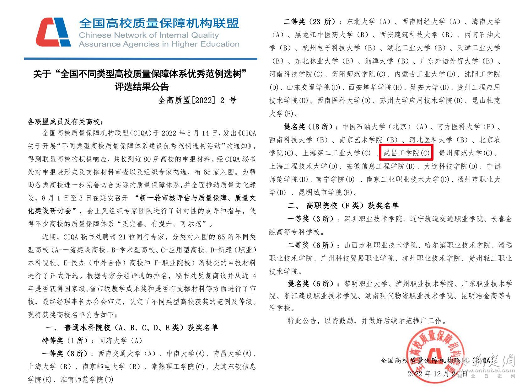 荆楚网(湖北日报网)讯(记者唐天琪 通讯员刘鼎)近日,全国高校质量保障机构联盟(CIQA)公布了“全国不同类型高校质量保障体系优秀范例选树”评选结果,武昌工学院选送的 “三全一闭”教学质量保障体系荣获提名奖,并将作为优秀范例报送教育部主管部门备案和认可。本次选树活动有来自全国的80所高校申报参加,武昌工学院是湖北省同类高校中唯一获奖高校。