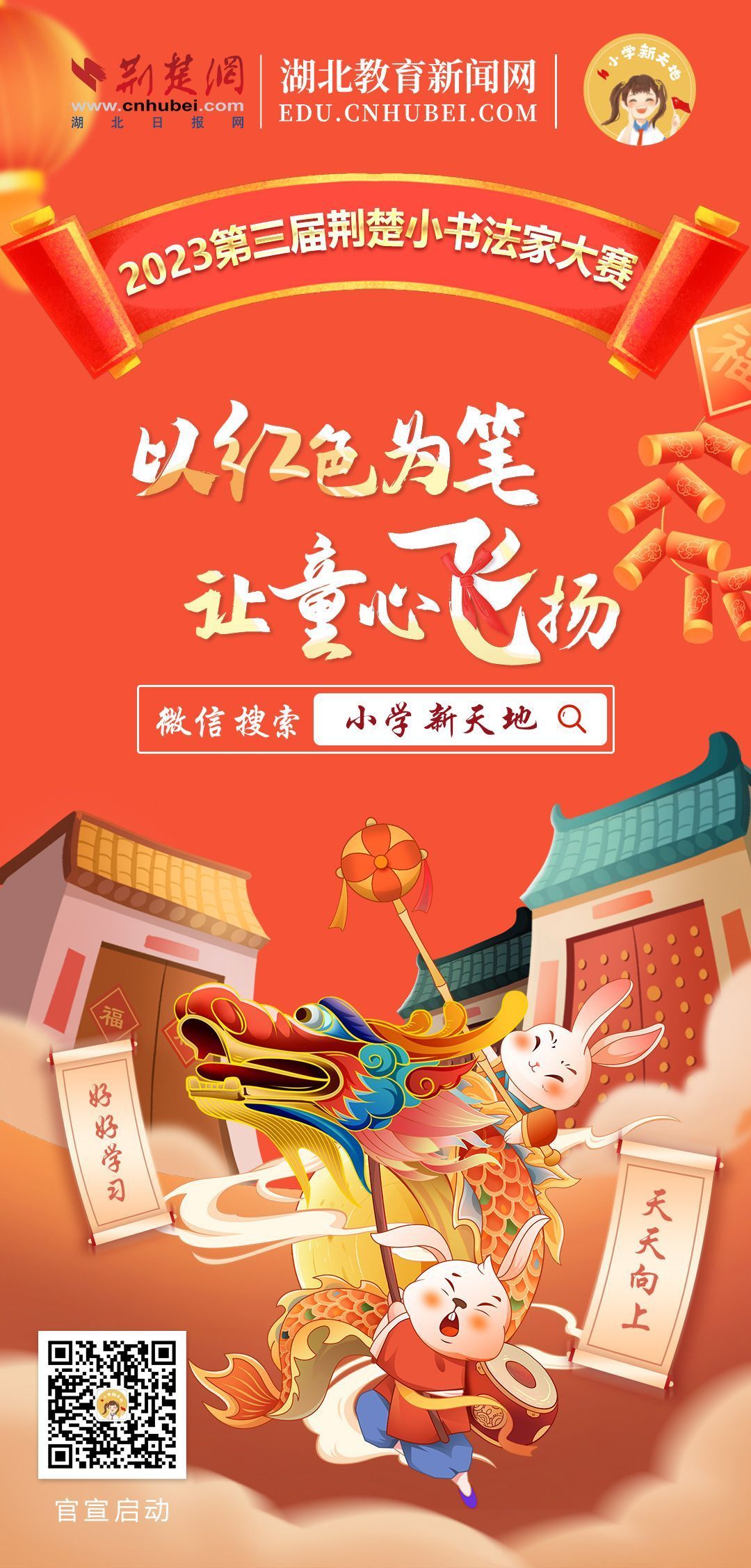 传统文化润童心,笔墨传情践文明。为给全省小学生提供一个广阔的素质教育实践平台,助力学校建设成为弘扬主流价值的高地、涵育中华文化的家园,荆楚网(湖北日报网)、湖北日报传媒集团“小学新天地”教育公众平台充分发挥党网党媒的主流媒体主阵地作用,共同推出“以红色为笔 让童心飞扬——‘小学新天地杯’2023第三届荆楚小书法家大赛”大型教育公益活动,引导师生争做传统文化的参与者、践行者、传播者,夯实素质教育基础,筑牢教育强国建设之基,助力教育高质量发展。赛事面向全省小学生征集优秀书法作品,号召小学生们以笔之名,书写红色诗词,以诗为媒,传承红色精神,为“眼中有光、笔尖有力、腹中有书、心中有爱、胸中有志”的时代少年们搭建舞台,丰富学生的寒假生活,展示校园正能量精神风貌!