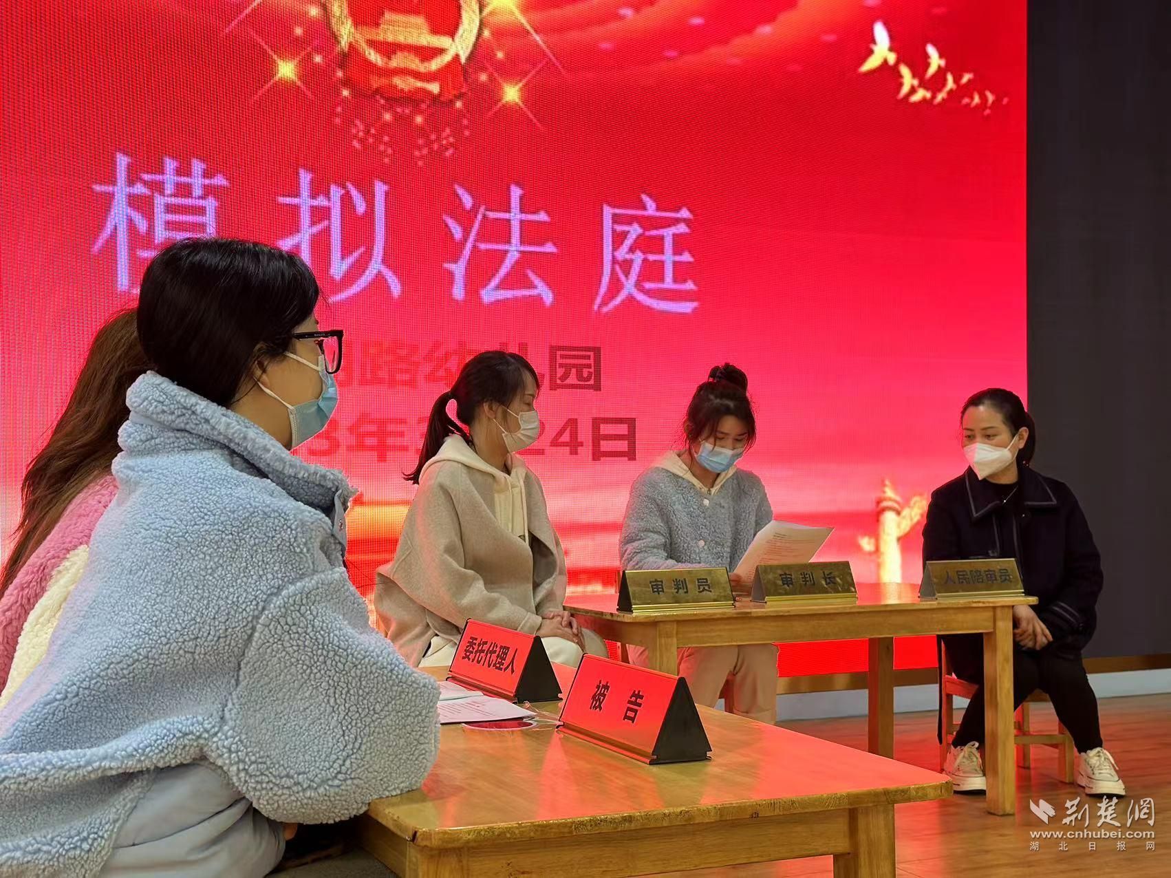 该园6名大班教师提前利用课外时间认真查阅法律知识,经过半个多月的精心准备,编排了一场模拟庭审。