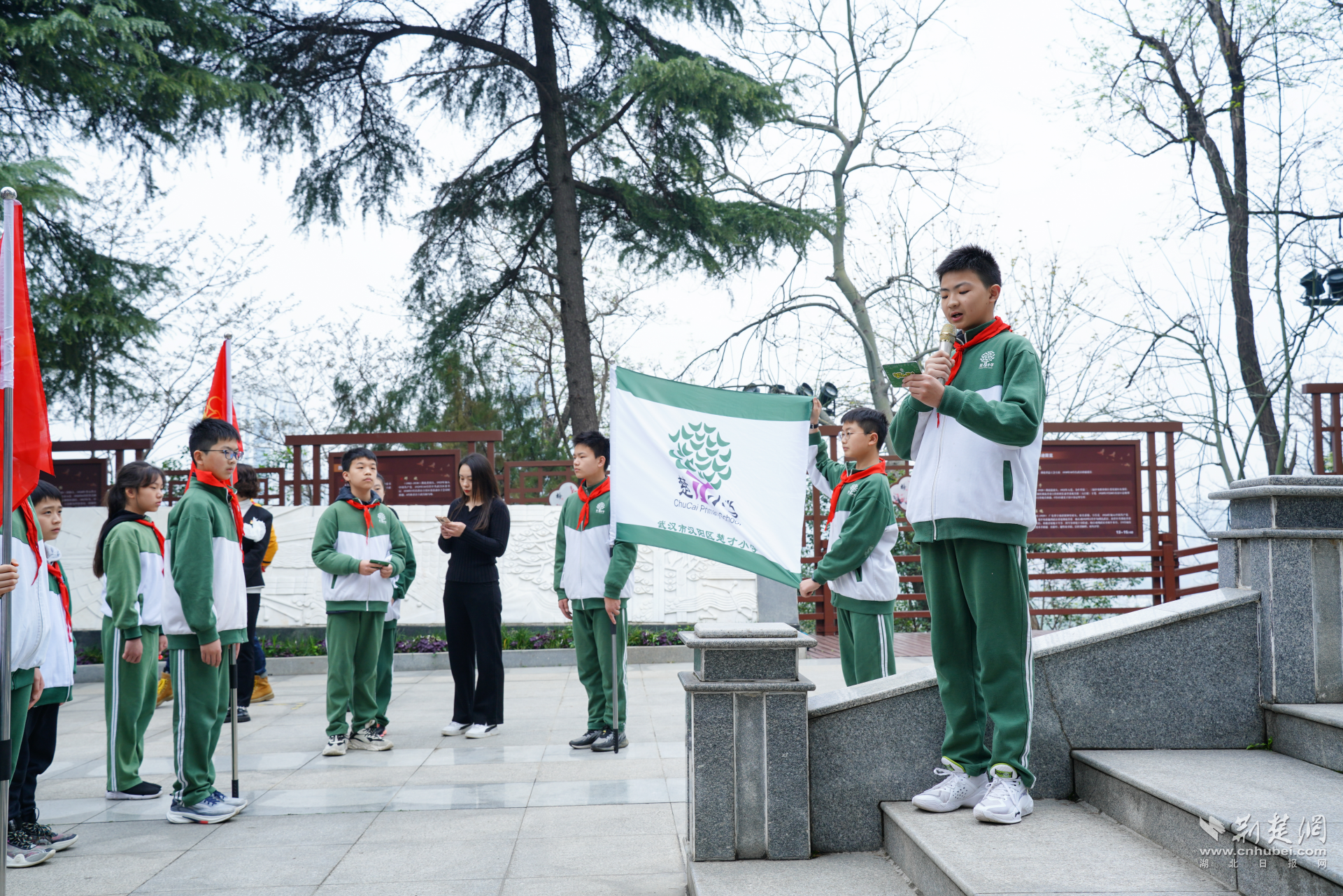 上午八时,师生们徒步来到向警予烈士墓前,举行了隆重的扫墓仪式。在凝重、肃穆的气氛中,师生向先烈默哀,深深鞠躬。少先队员们怀着崇敬的心情瞻仰革命烈士纪念碑。楚才小学“树少年”代表在烈士墓前,给英烈讲述祖国和家乡武汉的变化,告慰先烈之灵。六(5)班学生陈宇辰向向警予烈士汇报如今的祖国像一条巨龙屹立在世界的东方,并且愈发蓬勃,愈发强健;如今的武汉已跻身世界大都市,是一座英雄的城市。