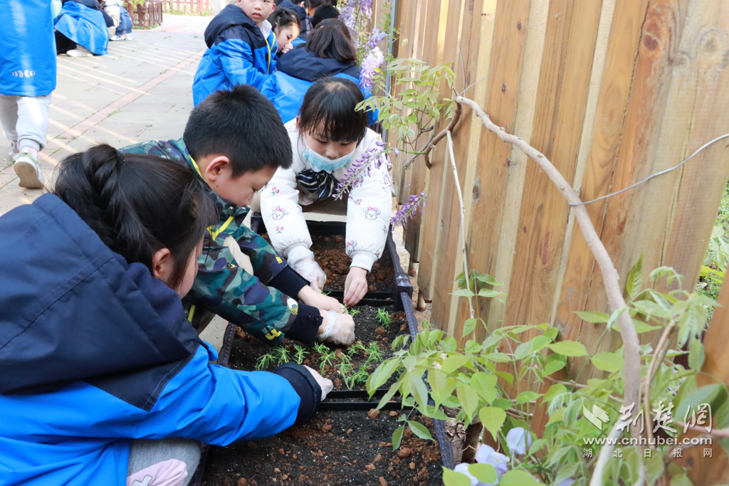 荆楚网(湖北日报网)讯(记者林杉 通讯员聂玲玲 实习生谢添羽)经过辛勤劳作,武汉经济技术开发区湖畔小学二年级学生都得意洋洋地欣赏着自己的播种下的点点新绿。“种植活动不仅让我们学习到各种植物知识,也让我们意识到绿色校园的建设需要大家齐心协力。”劳作后的学生们会心地表示。