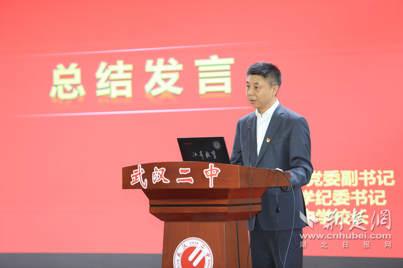 武汉二中党委副书纪、纪委书记、武汉市第二初级中学校长王新做总结发言。他表示,回望来时路,我们要铭记历史教训,牢记师者初心,崇尚清正廉洁。他要求初高中全体党员要深刻领悟“两个确立”的决定性意义,增强“四个意识”,坚定“四个自信”,做到“两个维护”,持之以恒抓好党风廉政建设工作,为二中和江岸教育高质量发展提供坚实的作风保障。