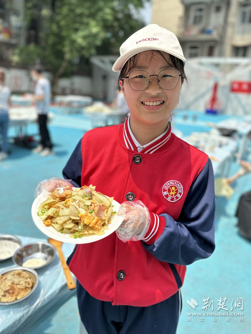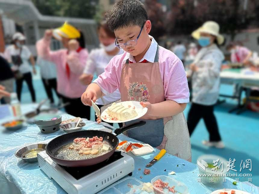 倒油、开火、下豆芽、颠炒、下配菜……同学们动作娴熟,俨然一个个小厨神。他们或炒,或拌,或炸,每个人做的菜都各具特色,各有滋味。同学们以豆制品为主要原料,用平时学到的烹饪技能,做起了一道道富有创意的美味佳肴。六年级的一位“小厨师”说道:“为了炒好豆丝,我在妈妈的指导下已经练习好几天,终于大功告成,好开心啊。”