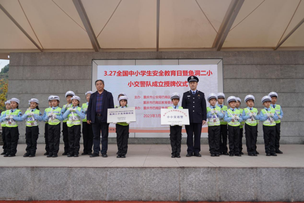 区教委、区公安分局在鱼洞二小联合开展交通安全进校园活动,并为新成立的小小交警队授牌。