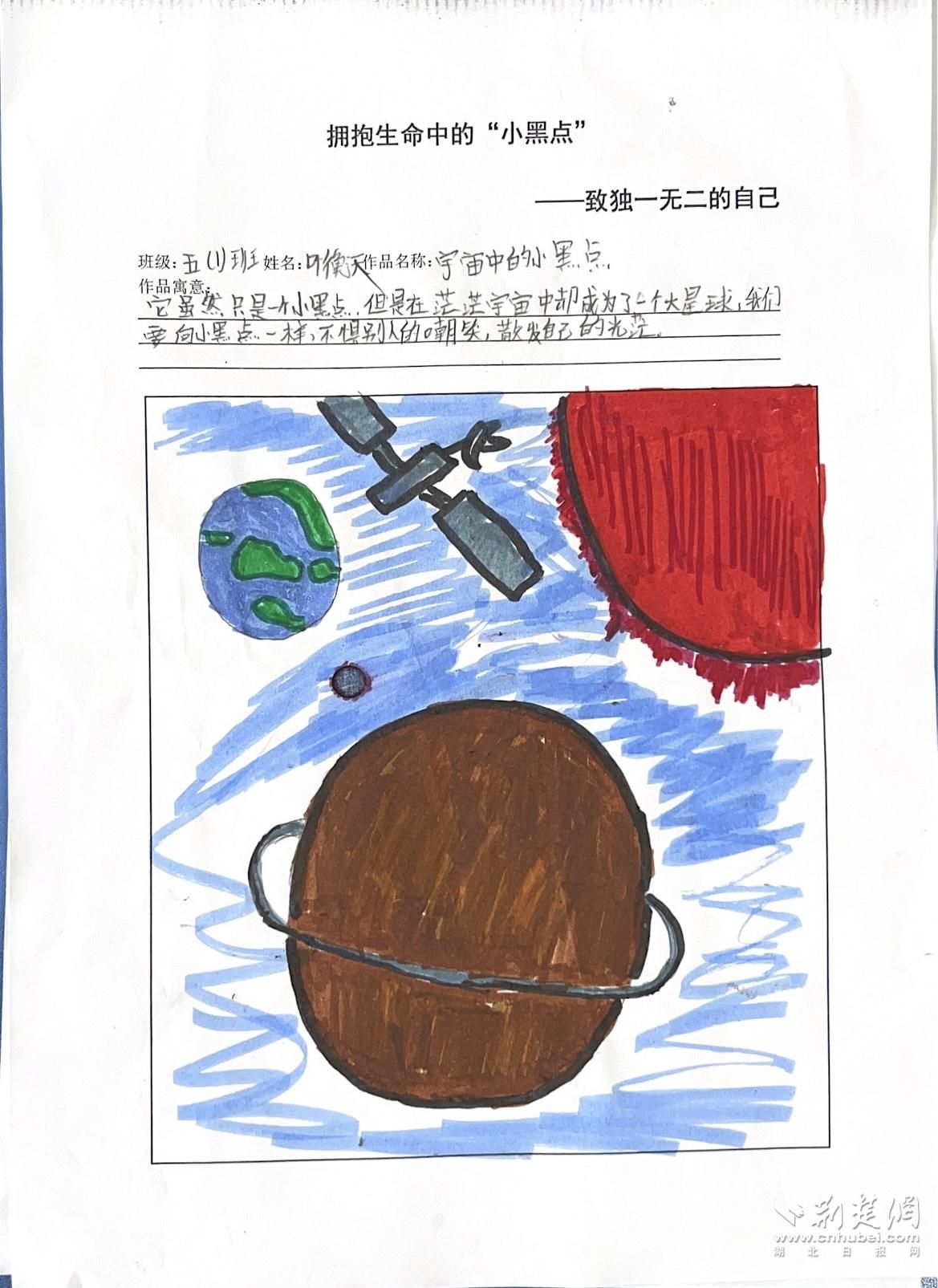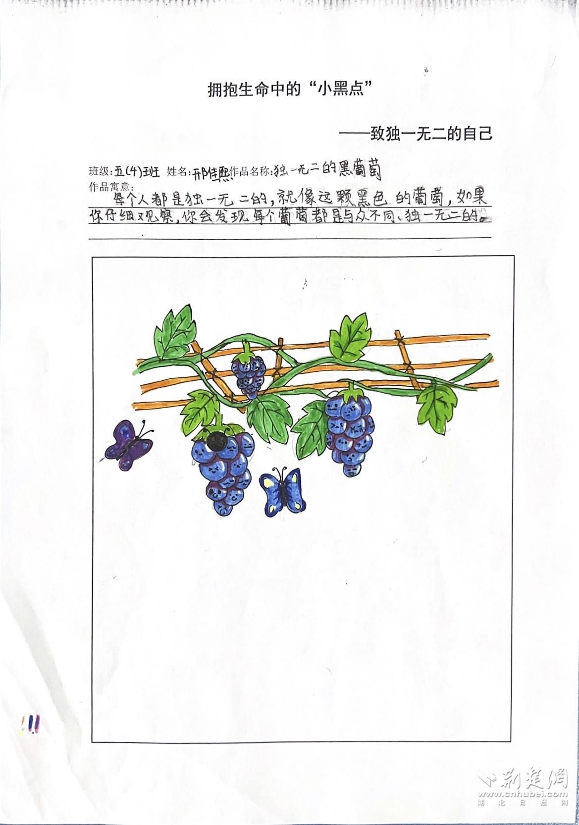 五(4)班邢佳熙创作的《独一无二的黑葡萄》中,小黑点是一颗黑葡萄,与其他紫葡萄略有不同却独一无二。世界上没有两颗完全相同的葡萄,该生还给每颗葡萄画上了表情,画面显得生动有趣。“每颗葡萄都是独一无二的,所以有缺点的人也是独一无二的。”五(1)班叶衡天《宇宙中的小黑点》作品中,小黑点被画成了宇宙中的星球,甚至能感受到它的能量。“缺点”在孩子的眼中甚至成了能量,还能散发光芒,寓意深远,引人深思。
