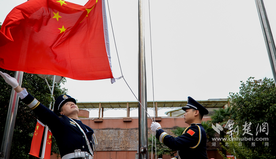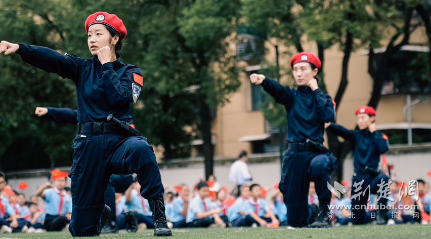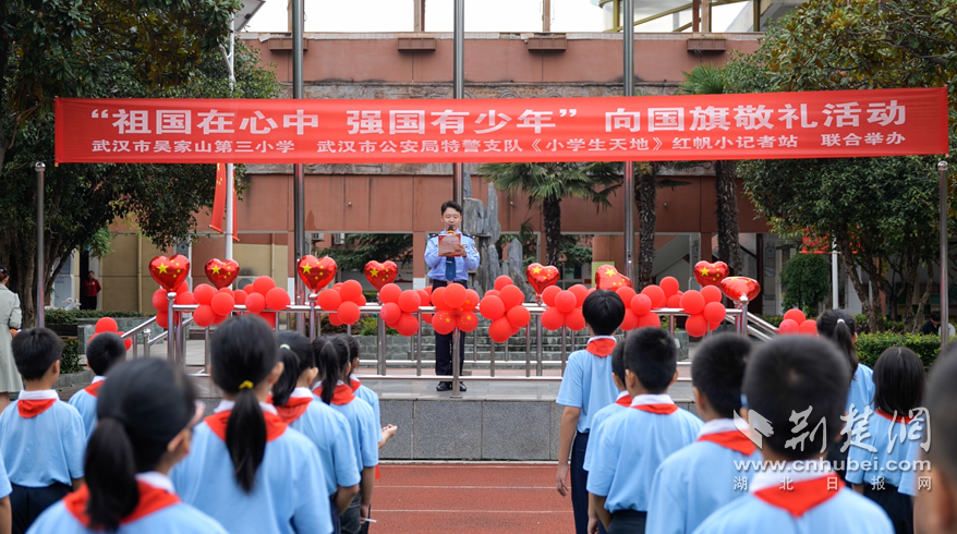 荆楚网(湖北日报网)讯(记者齐一璇、许文秀 通讯员吴菲、刘腾、孔珊)在国庆节来临之际,武汉市东西湖区吴家山第三小学举行“祖国在心中 强国有少年”向国旗敬礼活动。来自武汉市公安局特警支队陈蔚政法先锋队、江北机动大队、猛士突击大队、女子大队的警官们走进校园,用精彩的展示为全校师生带来了一堂沉浸式的爱国主义教育课。