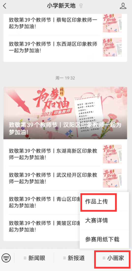 学生须为作品拍摄正面、高清照片,并用微信扫描“大赛专用纸”的二维码或搜索关注“小学新天地”微信公众号,点击“小画家”栏目,上传作品照片参赛。
