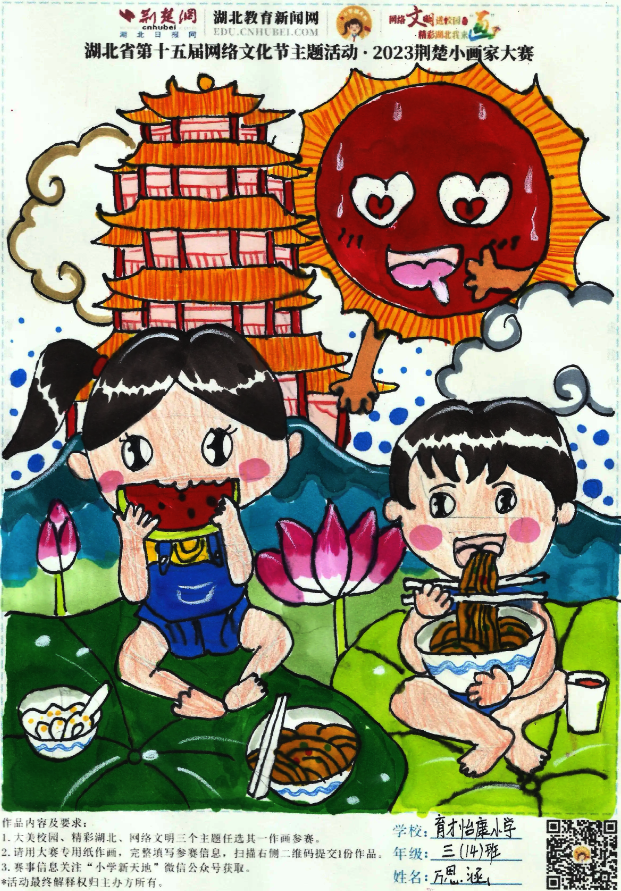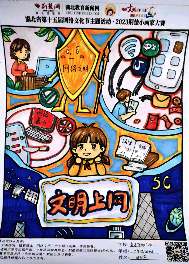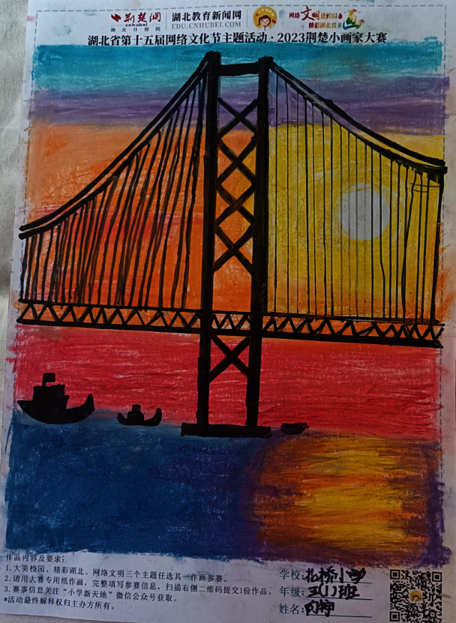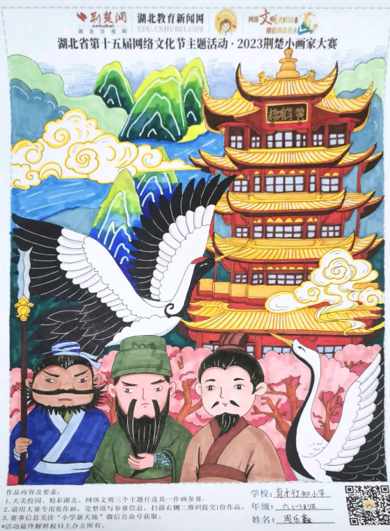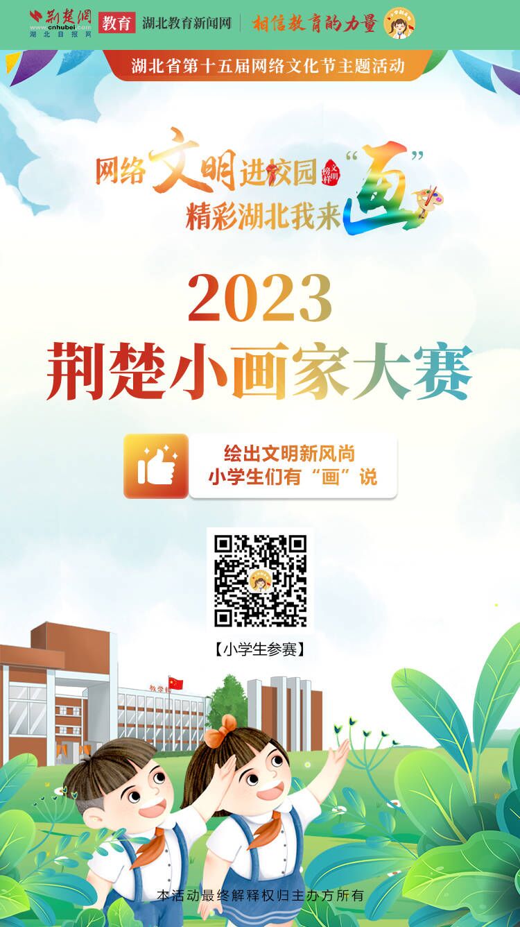 网络文明进校园,精彩湖北我来“画”。9月1日,荆楚网(湖北日报网)推出“网络文明进校园·精彩湖北我来‘画’——2023荆楚小画家大赛”大型教育公益活动。大赛为湖北省2023年“争做中国好网民”工程暨第十五届网络文化节活动项目,采取线上报名的方式,面向全省小学生们征集优秀绘画作品,号召小学生们共同描绘文化之美、家乡之美、校园之美,把校园文明新画卷绘就在精彩湖北征途上。