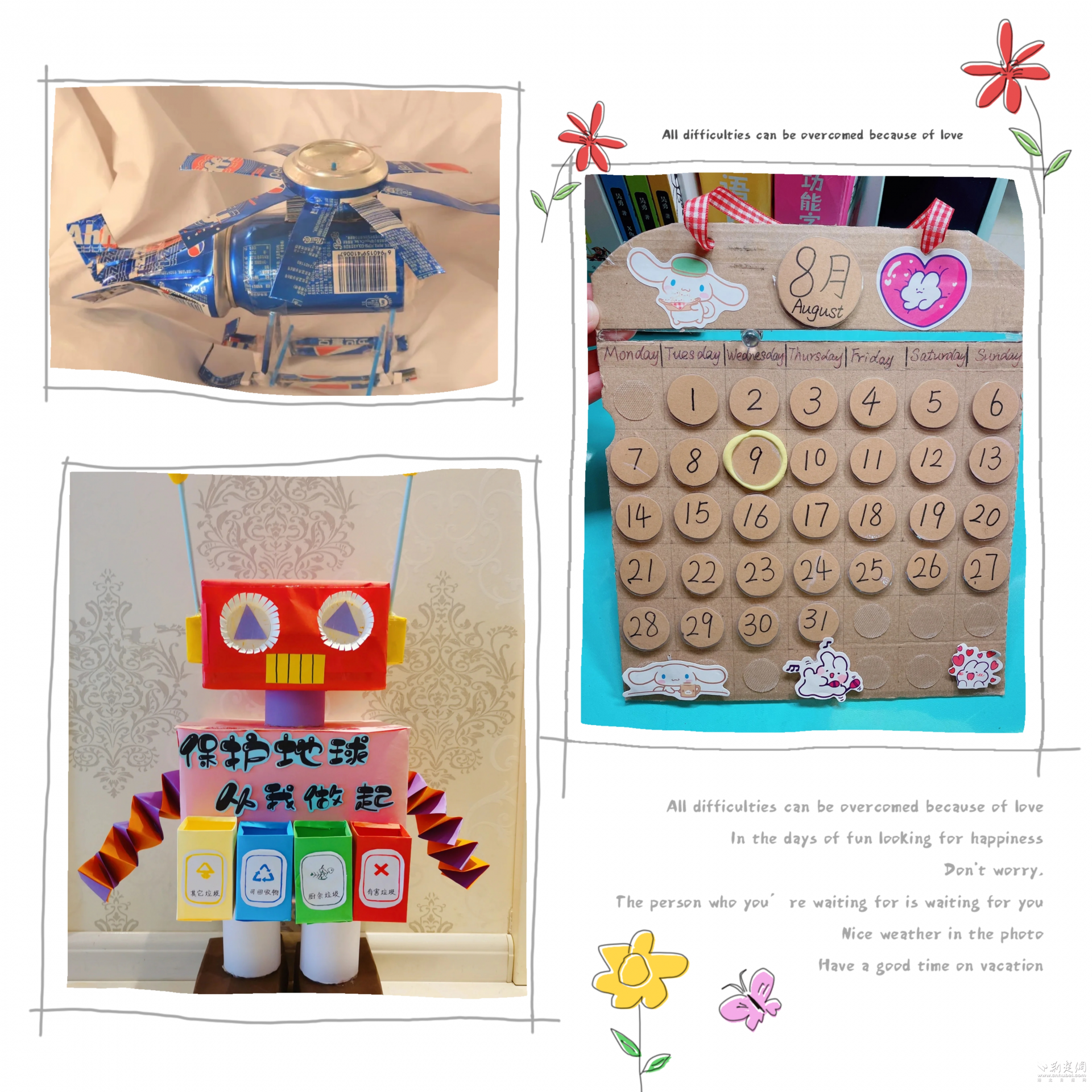 活动中,孩子们充分发挥聪明才智,将干花草、树叶、快递盒、矿泉水瓶、易拉罐瓶、废旧纸箱、洗洁精瓶子等原本要丢弃的废旧物品收集起来,与家长一起制成实用的各种创意小花盆、笔筒、花瓶和工艺品等,作品样式新颖,制作精美,五花八门,应有尽有,充分展现了学生们的想象力,锻炼了动手能力。