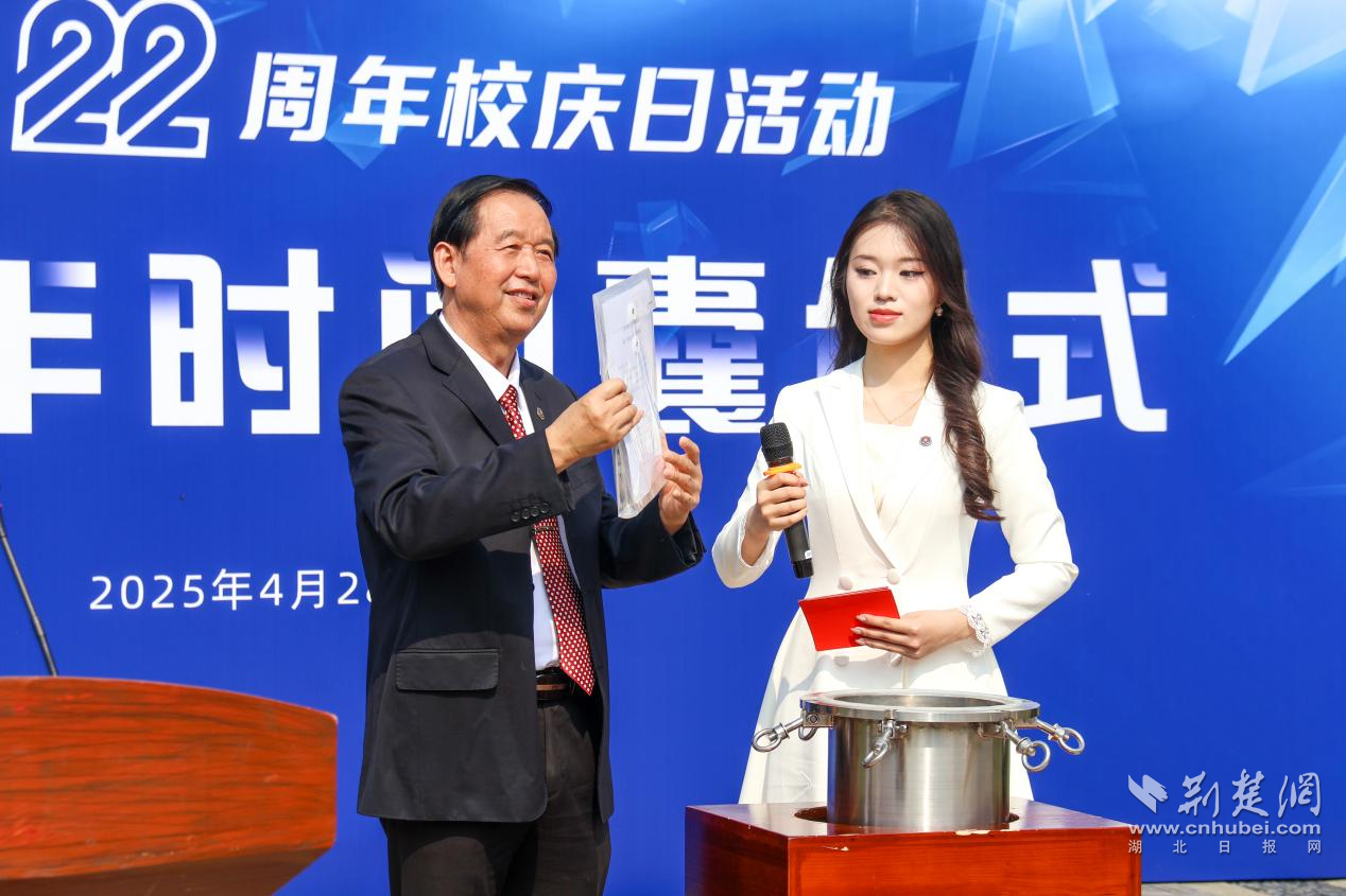荆楚网(湖北日报网)讯(记者唐天琪 通讯员罗茜)4月28日,武汉学院在22周年校庆之际举办2025年时间囊仪式,将存放年度纪念物品、标志成果的“百年时间囊”封存地下。时间囊封盖图案由AI辅助设计,定格人机协同、DeepSeek等AI技术标志,雕刻于时间囊广场。