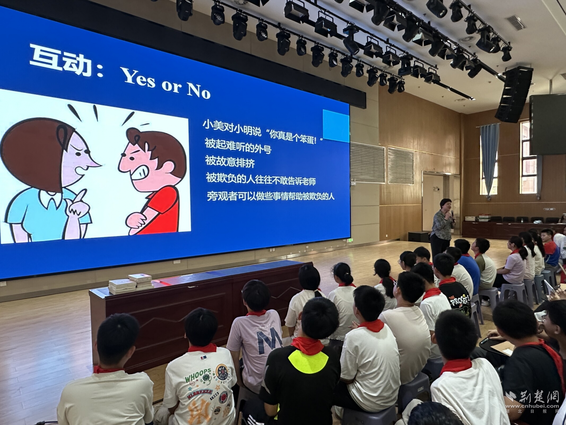 在深入讲解之后,讲座进入互动环节,周雯老师通过情景模拟、有奖问答等形式,将现场气氛推向高潮。学生们踊跃参与,积极回应,在轻松热烈的氛围中掌握了有效的沟通技巧、矛盾化解方法与情绪管理策略。她重申“勇敢拒绝、及时求助”的关键作用,鼓励每一位学生在面对欺凌时坚决说“不”,并主动向老师、家长及学校相关部门寻求支持。同时,她积极倡导同学们从自身做起,营造友善包容的班级氛围,通过团结互助、彼此尊重,共建零欺凌的校园文化,让每一位孩子都能在无欺凌的环境中健康成长、自信绽放。