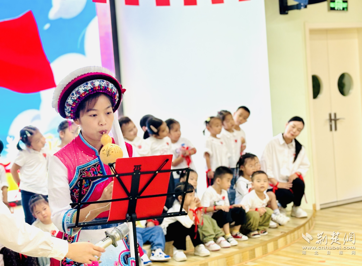 “祖国祖国我爱你,我们向你敬个礼!”上午9时,在小班孩子稚嫩的童声中,拉开活动序幕。云南白族老师身着特色民族服饰,手持葫芦丝轻轻吹奏,悠扬婉转的丝竹声与孩子们的歌声交织,音符里满是民族文化的交融与童真的热爱。中大班师幼以多样形式礼赞祖国,将红色教育融入活动:或模仿敬礼致敬国家符号,或借歌曲赞美祖国山河、传递童真祝福,或结合朗诵立下远大志向,更有师幼以江汉原创歌曲歌曲抒发对故土的深切情感。红色基因在歌声与行动中传递,让“了解祖国、赞美祖国”的思政教育生动落地。