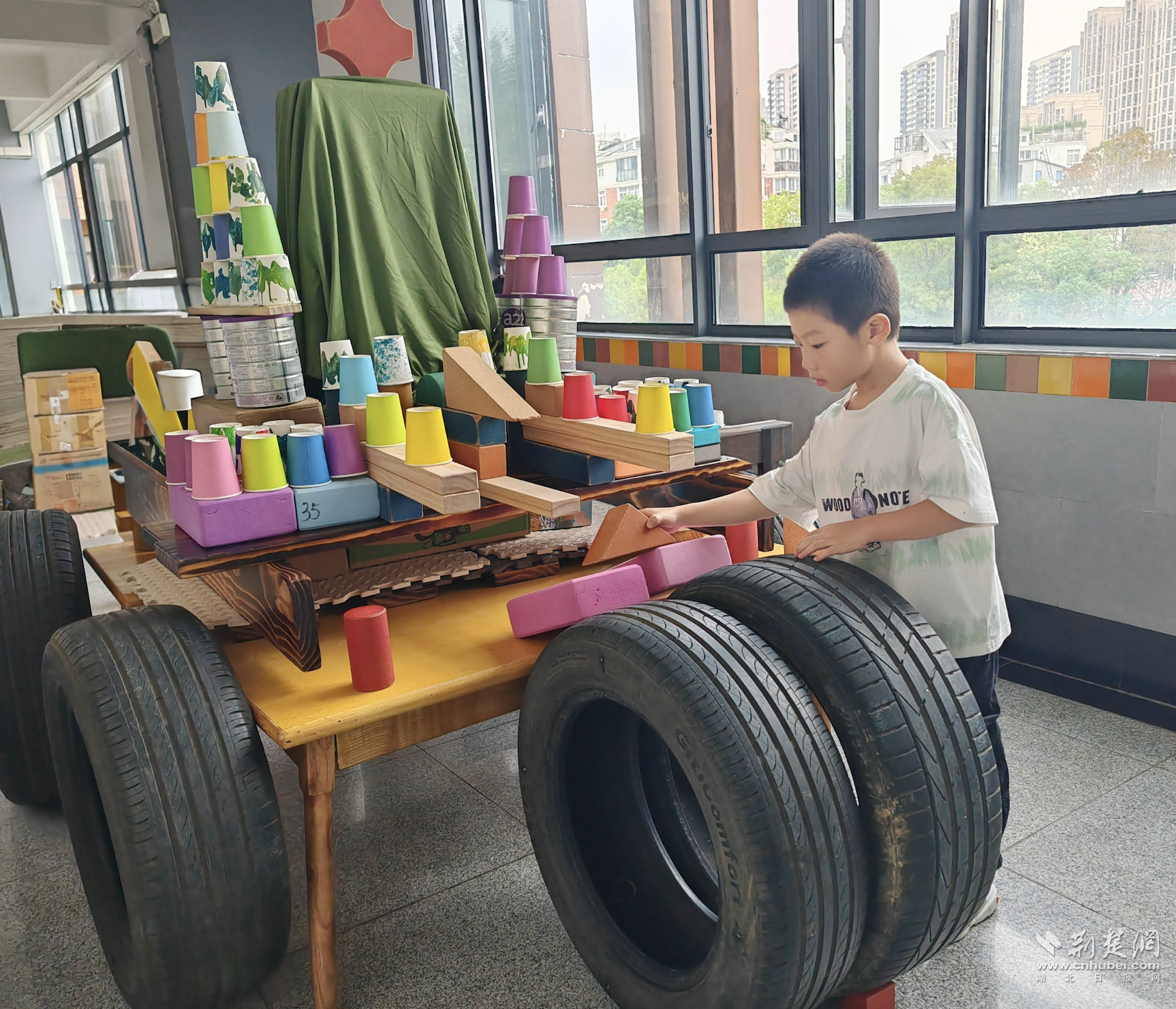 从画纸上的崇敬到手中的创造,爱国情怀在实践协作中进一步升华。在搭建区,孩子们以小组为单位,通力合作,将平日里常见的积木、纸盒、彩纸等材料,变身为宏伟的“国之重器”与地标建筑。一组孩子专注于还原天安门城楼的巍峨,仔细粘贴着象征性的红墙黄瓦;另一组孩子则合力构思,将零散的部件组装成威武的坦克和矫健的“战斗机”。在相互帮忙与思想碰撞中,团队的智慧凝聚成一件件充满创意的作品。