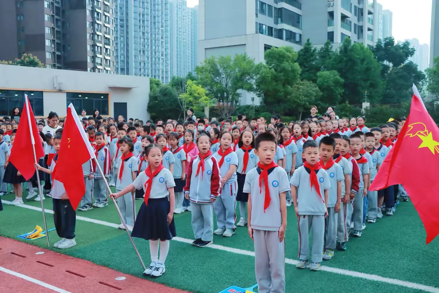 “出旗!敬礼!”随着一声令下,激昂的《出旗曲》响起。三名旗手迈着坚定有力的步伐,护卫着中国少年先锋队队旗庄严入场。全体少先队员和辅导员凝视队旗,敬以最标准的队礼。