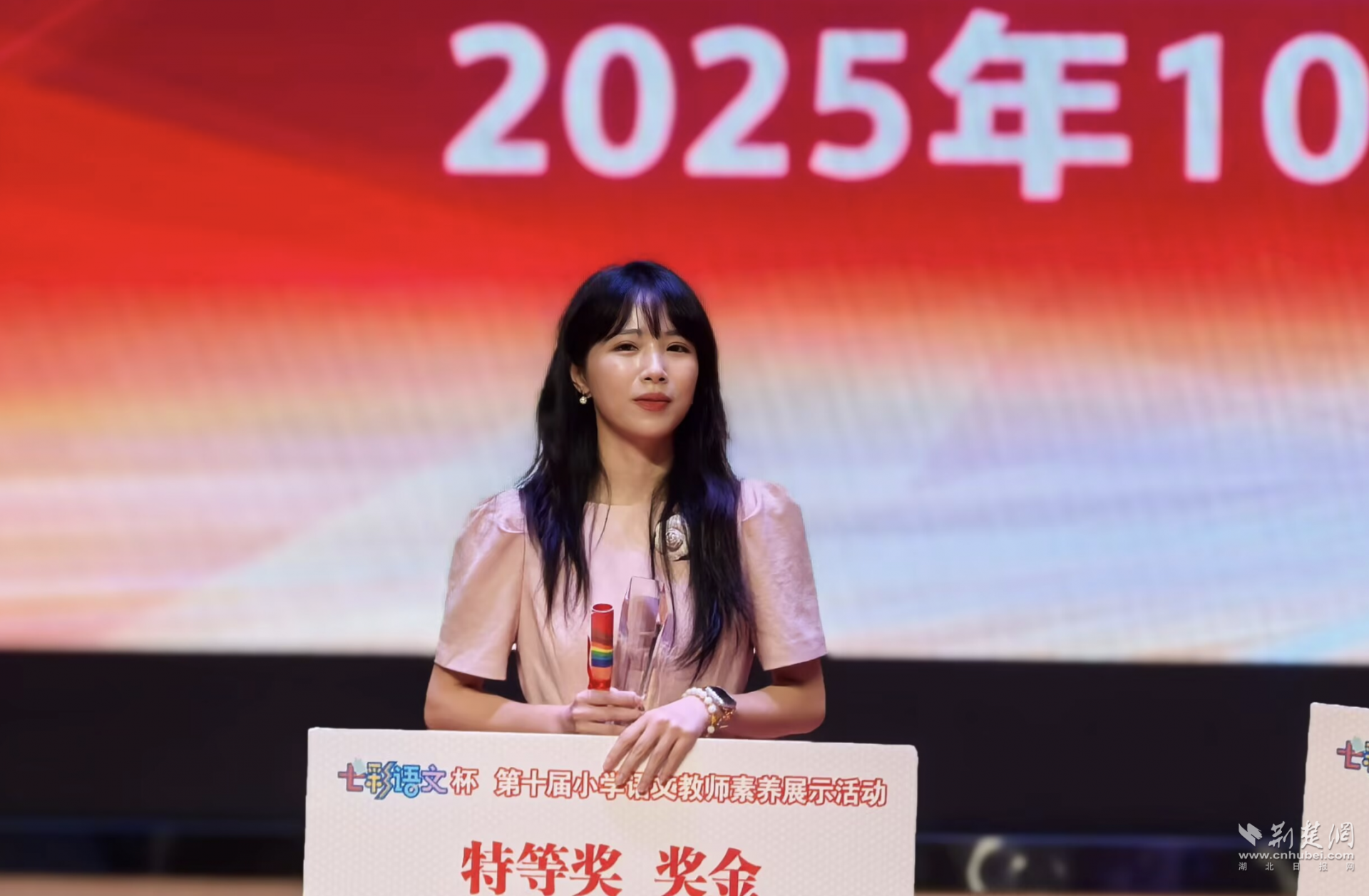 荆楚网(湖北日报网)讯(记者林杉 通讯员邓晓慧)10月17日,“《七彩语文》杯”第十届全国小学语文教师素养大赛在南京落幕。来自武汉经开区神龙小学的陈卉昕老师经过层层选拔,成为湖北省唯一参赛代表,与全国30多个省份的优秀教师同台竞技。这位年轻教师凭借全面的专业素养和扎实的教学功底,最终以总分第一的成绩荣获特等奖。