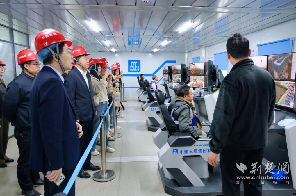 嘉宾实地观摩了中建三局汉韵公馆智能建造试点项目。项目现场,数字孪生生命线实时联动、智能塔机集控中心精准调度、造楼机高效作业,一系列智能建造科技赋能打造“好房子”。