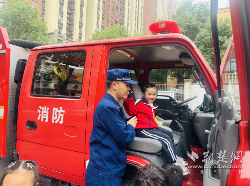 荆楚网(湖北日报网)讯(记者何鹏 通讯员刘佳莹)“哇!消防车的警笛声音好大呀!”“这个头盔沉甸甸的,消防员叔叔好辛苦!”在“119”消防宣传月来临之际,江汉区童趣幼儿园的萌娃们与江汉区泛海消防救援站,开启了一场趣味十足、干货满满的消防安全“探秘之旅”,在亲身体验中读懂安全密码,向“火焰蓝”致敬。