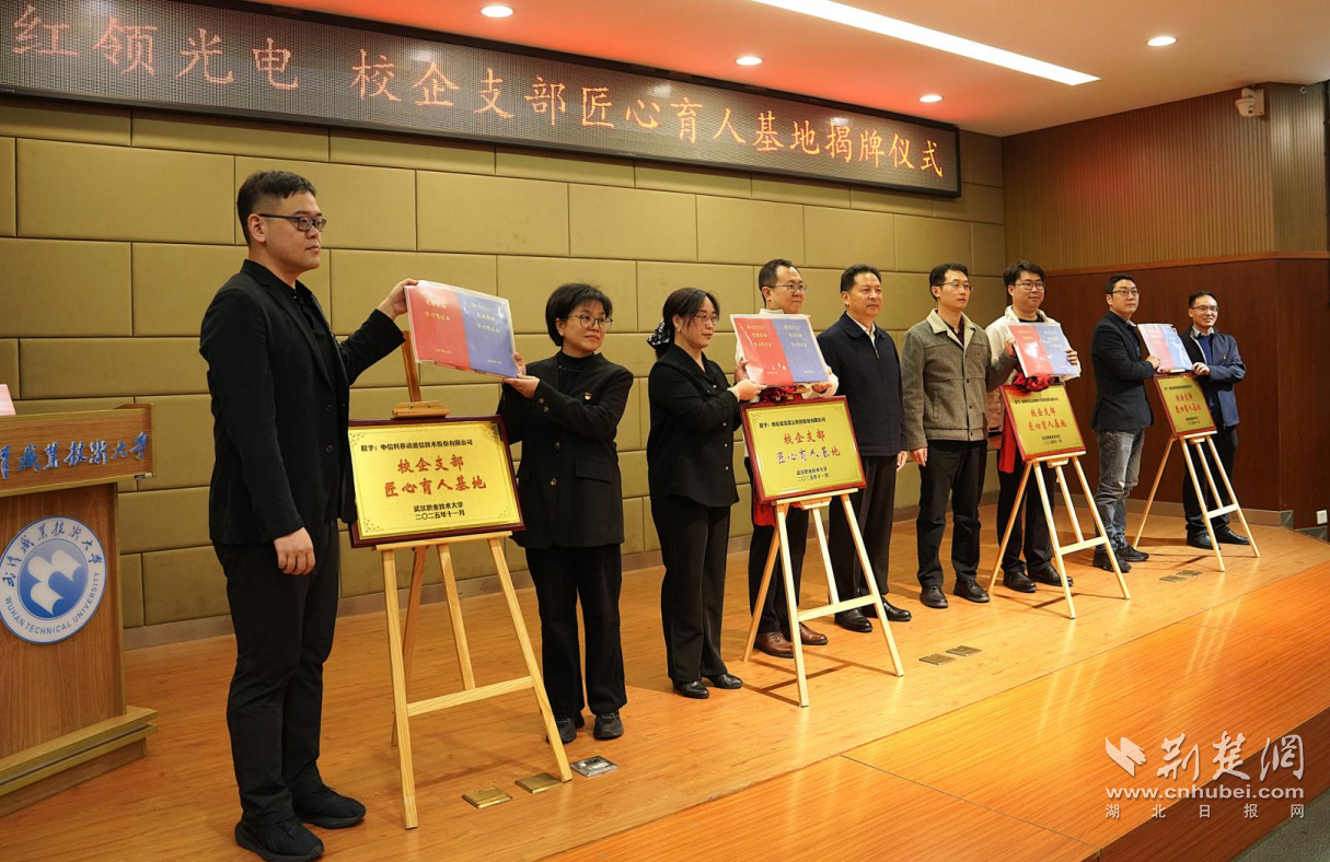 荆楚网(湖北日报网)讯(记者何鹏、许文秀 通讯员刘晶 摄影王诚)党建锚定产教融合,匠心共育技术先锋。11月8日上午,“武汉职业技术大学·红领光电”校企支部匠心育人基地揭牌暨入党积极分子“双导师”结对仪式在该校举行。来自校企双方的领导、技术导师、党建导师及师生代表共聚一堂,共同见证这一深化产教融合、强化红色育人的重要时刻。