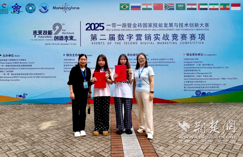 荆楚网(湖北日报网)讯(记者齐一璇 通讯员李旭芳、胡雨婷)近日,2025“一带一路”暨金砖国家技能发展与技术创新大赛第二届数字营销实战竞赛赛项总决赛在东莞职业技术学院落幕。武汉船舶职业技术学院两支队伍出征,载誉归来。一队由刘雯、詹晓丽老师指导,曹杉杉、陈子萱同学凭借扎实专业功底和默契协作,斩获银奖。二队陈雅丽、林悦同学在李旭芳、余帅老师带领下,展现过硬专业素养,沉着应战,拿下铜奖。