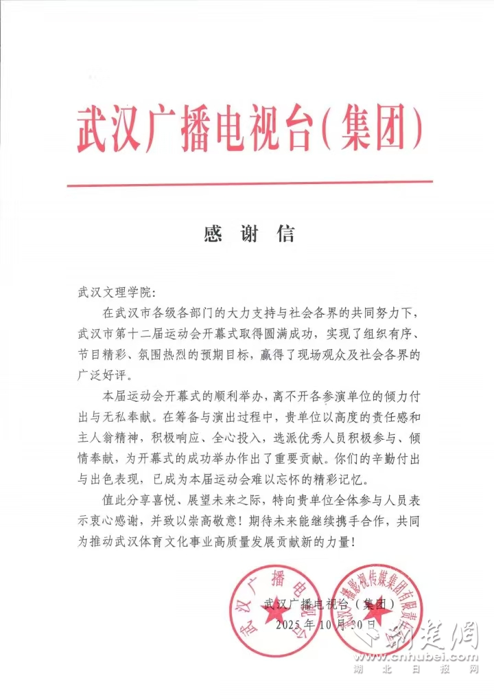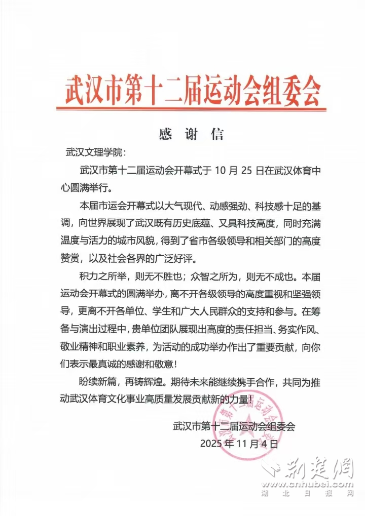 荆楚网(湖北日报网)讯(记者唐天琪 通讯员施慧丽)近日,武汉文理学院收到武汉市第十二届运动会组委会和武汉广播电视台发来的感谢信,字里行间充满着真挚的谢意与高度认可。这份肯定不仅是对学校助力市运动会的褒奖,更彰显了武汉文理学院高尚的精神风貌,为这场“逐梦车谷,乐动江城”的体育盛会注入强劲动力。