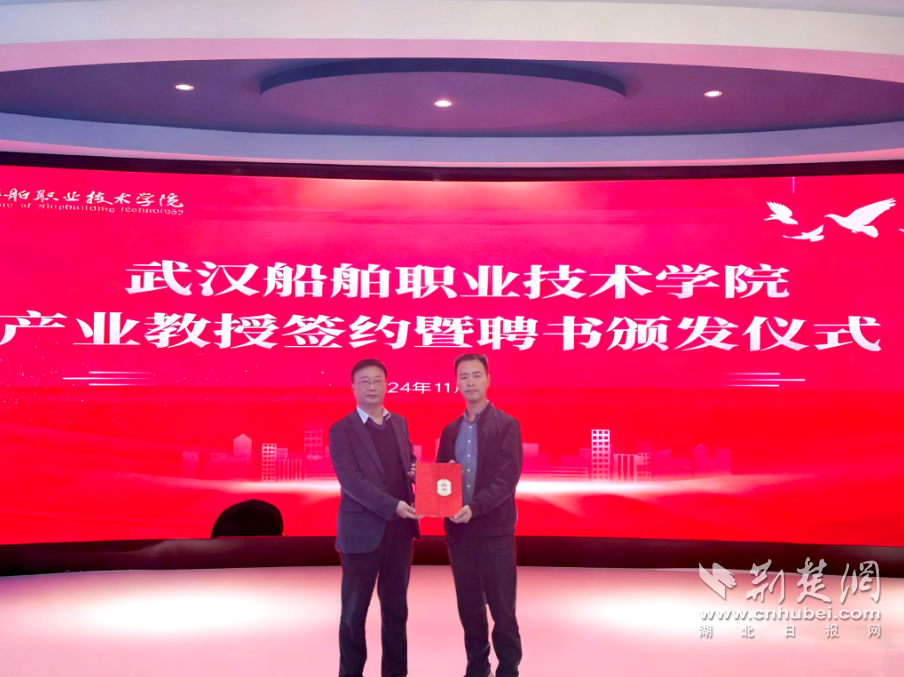 荆楚网(湖北日报网)讯(记者齐一璇 通讯员金丽霞、徐梦瑶、王瑜德)近日,武汉船舶职业技术学院与武昌船舶重工集团有限公司中国船舶集团技能带头人王飞签订了“湖北产业教授”聘用合同并颁发聘书。签约仪式在该校虚拟仿真中心举行。武汉船舶职业技术学院副院长王贞志、人事处处长周飞、船海学院院长吴春芳等参加签约仪式,船海学院副院长郑亚雄主持。