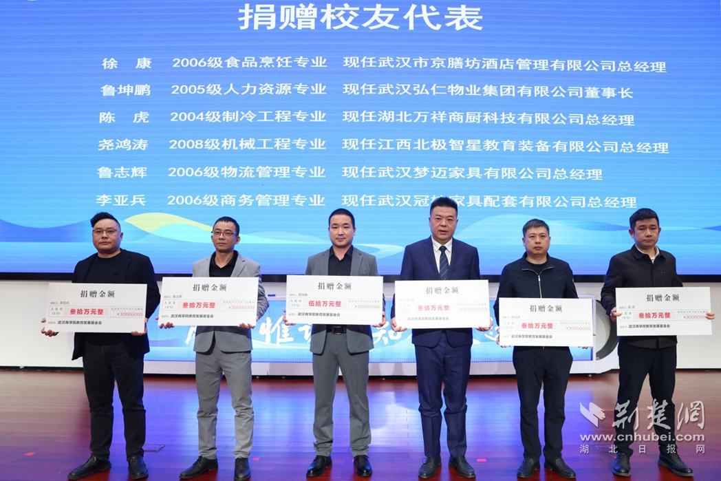 校友的深情厚谊是学校发展的不竭动力。大会举行了武汉商学院教育发展基金会发起人认捐仪式。2006级食品烹饪专业徐康、2005级人力资源专业鲁坤鹏、2004级制冷工程专业陈虎、2008级机械工程专业尧鸿涛、2006级物流管理专业鲁志辉、2006级商务管理专业李亚兵六位校友代表上台,以实际行动反哺母校。