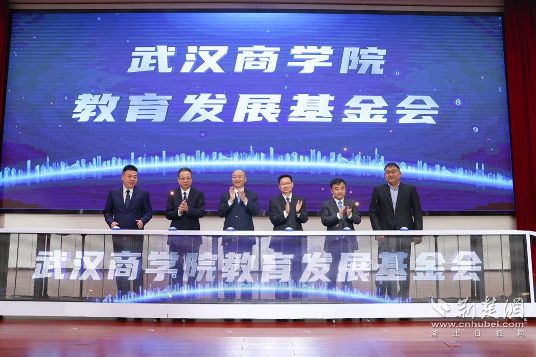 在全体嘉宾的倒计时中,孟武康、彭瑜、雷鸣、赵永强,校友代表徐康、李清华上台共同为武汉商学院教育发展基金会揭牌。