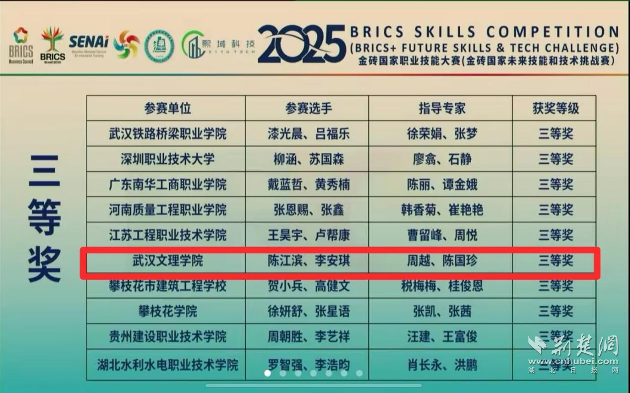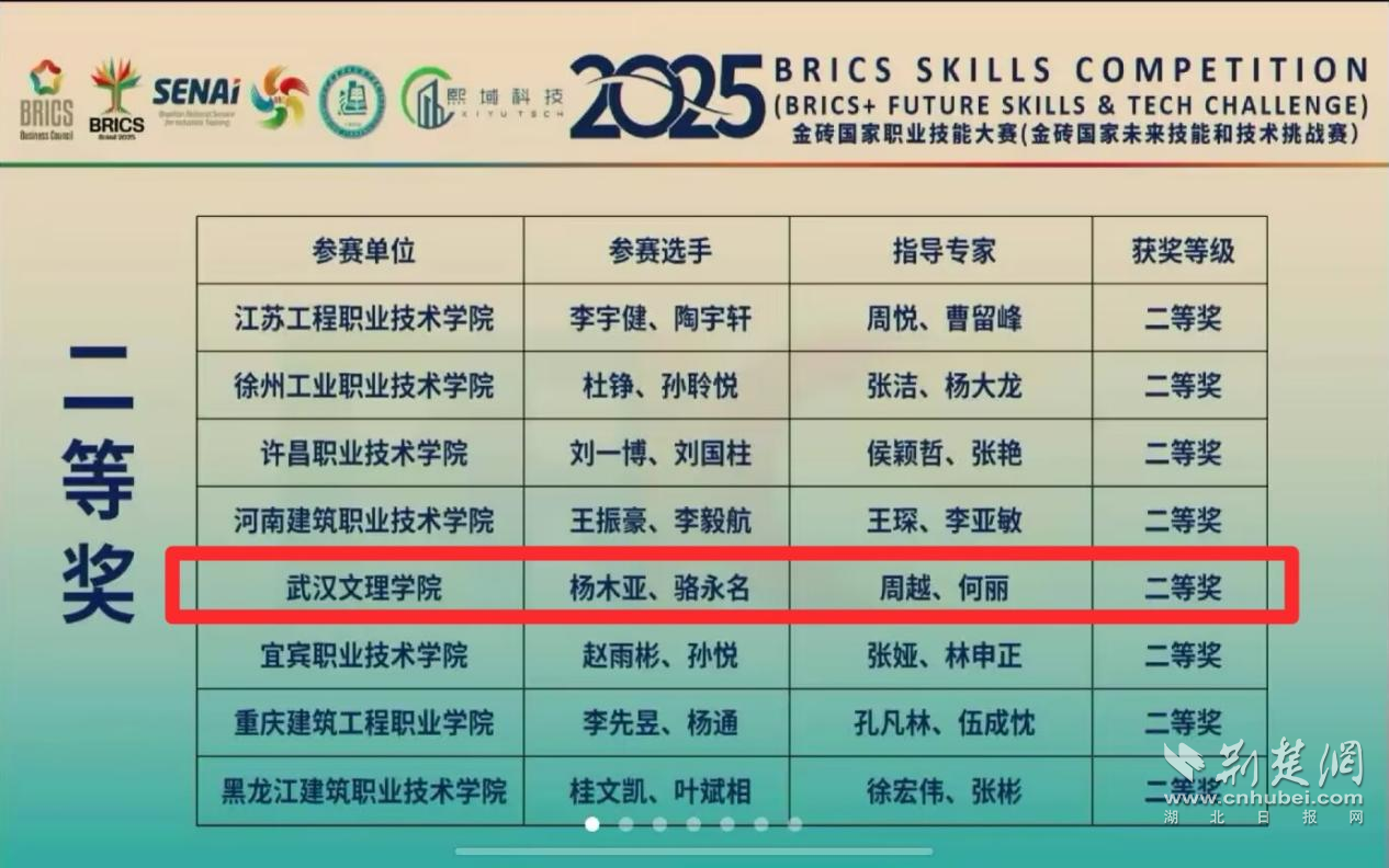 荆楚网(湖北日报网)讯(记者唐天琪 通讯员施慧丽)近日,2025金砖国家职业技能大赛建筑信息建模(BIM)赛项圆满落幕。武汉文理学院智能制造与无损检测学院派出的两支参赛队伍,从全国众多高校团队中脱颖而出,分别斩获二等奖和三等奖。其中,由杨木亚、骆永名组成的参赛队伍成功晋级国际总决赛,将代表中国登上金砖国家技能交流的国际舞台。