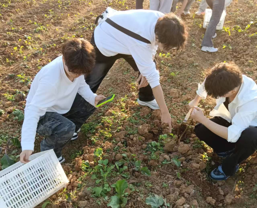 田间地头,同学们热情高涨地投入到各项农事活动中:齐心协力栽种小巧的多肉植物,俯身弯腰在田垄间亲手栽下洪山菜苔的幼苗,在蔬菜大棚里小心翼翼地用剪刀收割香榧,三五成群地在秋收后的红薯地里挥动小锄头,兴致勃勃地翻找藏于泥土中的红薯……这些对多数同学而言前所未有的新鲜体验,极大地激发了他们的参与热情。在园区技术员的指导下,他们认真熟悉着各种现代农业工具,俯身于苗床之间,专注地进行多肉移植、月季栽种、香榧采割等农事活动。