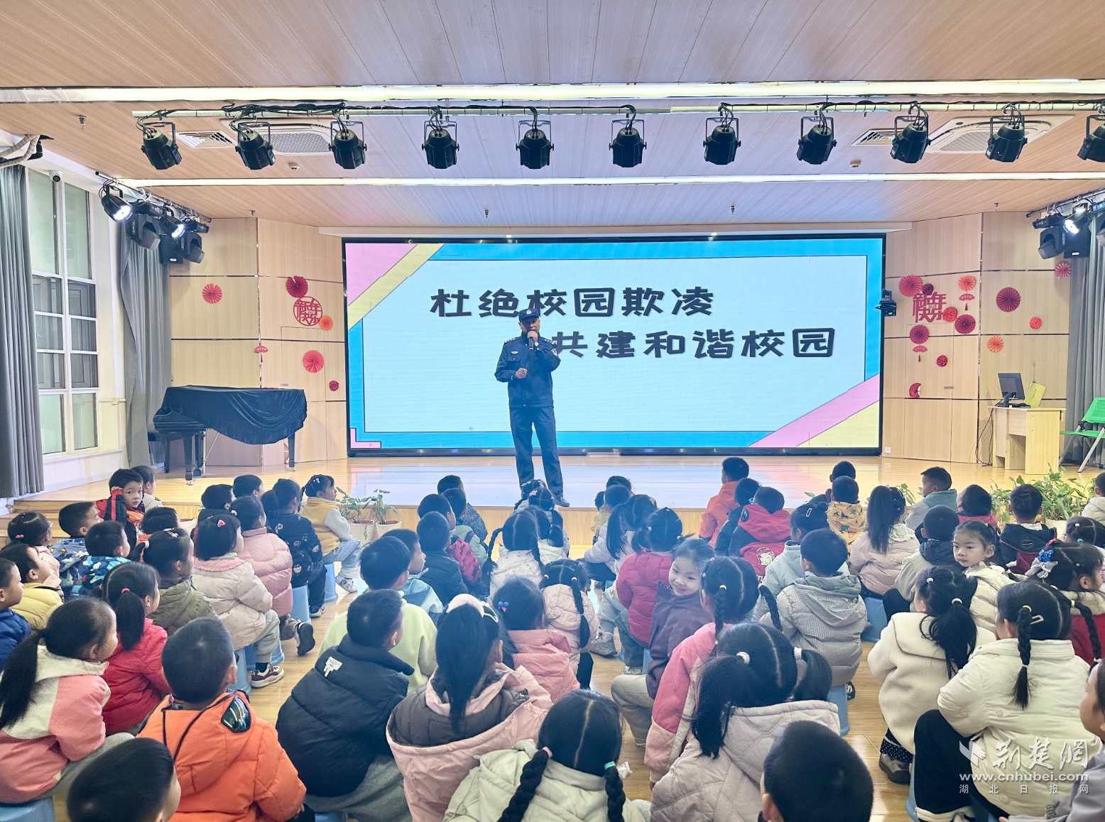 在普及交通安全知识的同时,幼儿园也将法治教育纳入安全体系。胡克宏为大班幼儿作了《防欺凌》专题法治讲座。他用通俗语言解释校园欺凌的表现形式,通过案例分析、情景模拟,引导幼儿学会识别欺凌、保护自己,树立友好相处的交往理念。