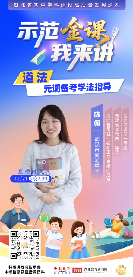 荆楚网(湖北日报网)讯(记者 齐一璇)道法学习只会死记硬背?面对元调主观题总抓不住得分点?12月21日(本周日)晚7:30,“示范金课我来讲——湖北省初中学科建设高质量发展巡礼”活动将推出道法学科专场。武汉市南湖中学道德与法治教师陈佩将携独家备考秘籍亮相直播间,教你用思维之道”破解“解题之法”,实现从“学会”到“会学”的跨越!