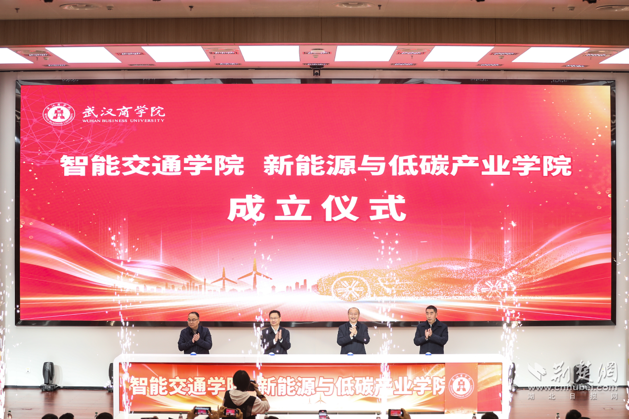 荆楚网(湖北日报网)讯(记者齐一璇 通讯员卢蕾雅、阳雅丽)为优化专业结构、强化特色发展,12月18日,武汉商学院智能交通学院、新能源与低碳产业学院正式揭牌。武汉市交通运输局党组书记邹耘、武汉市发展和改革委员会副主任张文波、武汉商学院党委书记孟武康、校长彭瑜共同为新学院揭牌。两学院现场签署多项校企合作协议,共同开启政、行、企、校融合发展的崭新篇章。