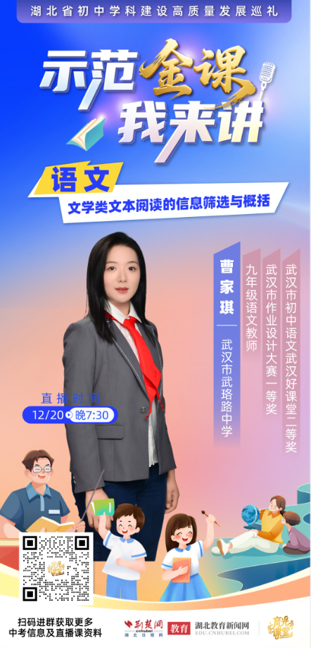 荆楚网(湖北日报网)讯(记者齐一璇)12月20日晚7时30分,一场聚焦文学类文本阅读技巧的“智慧风暴”在云端热烈展开。在荆楚网(湖北日报网)策划的“示范金课我来讲——湖北省初中学科建设高质量发展巡礼”直播中,武汉市武珞路中学语文教师曹家琪,以一堂精彩纷呈的“思语意流向 学精准概括”课,为师生们解锁了高效阅读文本的“金钥匙”。