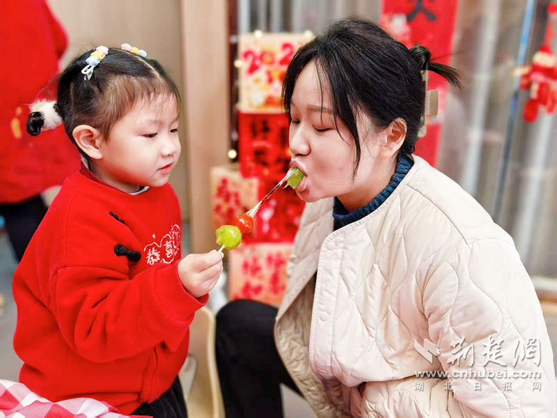 珞珈山街幼儿园的“庙会”现场,家长和孩子共品糖葫芦的香甜。通讯员供图