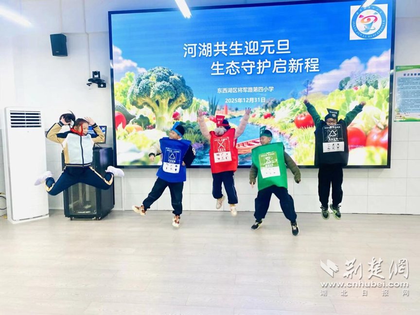 荆楚网(湖北日报网)讯(记者齐一璇 通讯员万亚军、胡仕佳)2025年12月31日下午,武汉市东西湖区将军路第四小学举办“河湖共生迎元旦 生态守护启新程”活动。全体师生在融合节日氛围与生态教育的活动中,开启意义非凡的生态守护新年之旅。