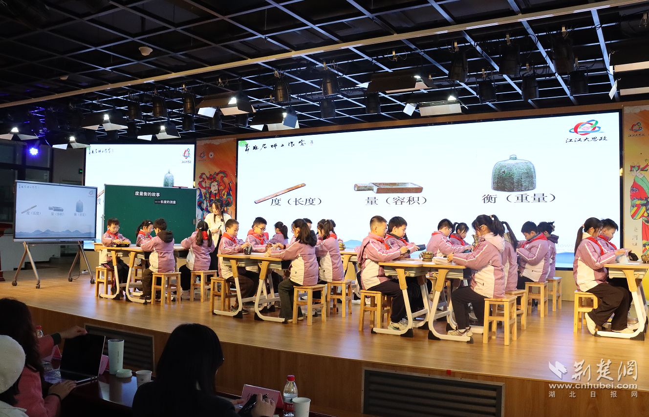 跨学科课程展示环节,江汉区红领巾学校毛铭欣老师以《度量衡的故事》为主题,带领学生了解“度”的演变与发展,用强烈的对比揭示统一标准的必要性,感悟度量标准由主观到客观、度量单位由粗略到精细的过程。学生在动手排列黍米还原古尺的过程中,不仅理解了统一标准的必要性,更体会到“规则”、“诚信”的社会价值。