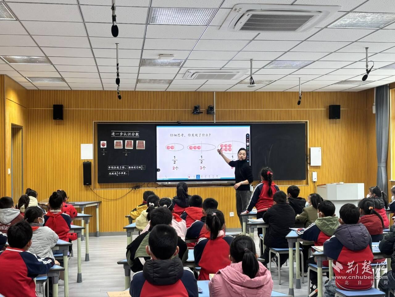 数学教研中,六位教师依次展示《植树问题》《进一步认识分数》等课。邱红在教学时引导学生用图示法解决问题,郭秋艳则通过实物分配深化分数概念。经开区教研室副主任王素培在评课时提出:“借助AI分析课堂行为,能让教学改进更有依据。”教师们随后就如何利用技术实现从经验教研到数据教研的转变展开交流。