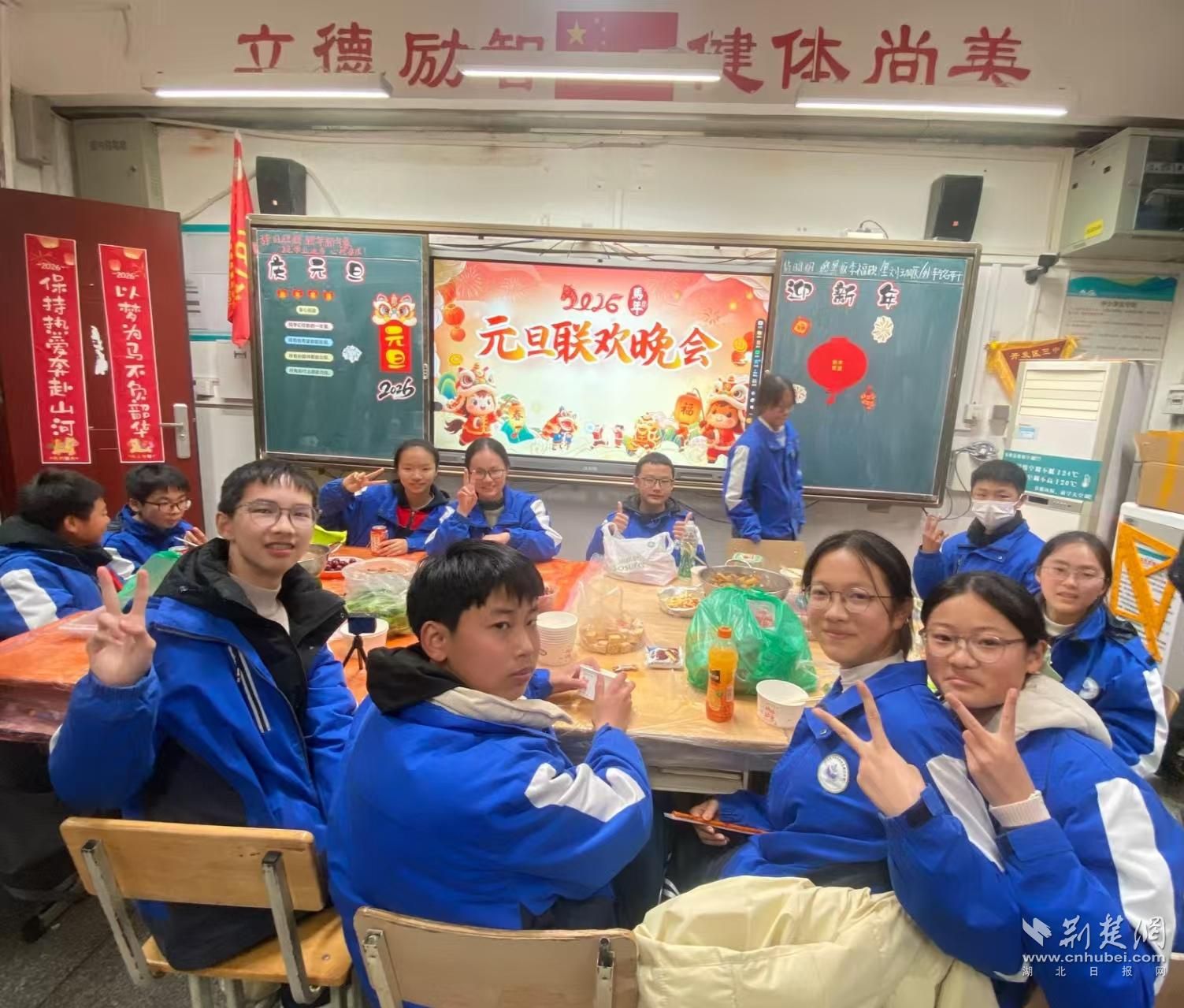 荆楚网(湖北日报网)讯(记者林杉 通讯员徐梦桥)岁末的武汉经济技术开发区第三中学八(8)班,景象与平日不同。课桌拼接成席,两组火锅在中央沸腾,清汤与红汤咕嘟作响,肥牛、鱼丸、时蔬等食材整齐码放两旁。2025年12月31日晚,该班的师生围坐在一起,用一场独特的火锅节活动迎接新年。
