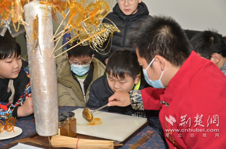 香囊工坊内,学生们将干桂花与艾草、丁香等温性香料相配,缝制成可佩戴、可馈赠的“暖冬香佩”,既御寒亦养心;教室里飘着淡淡的甜香,糖画台前,非遗师傅指导熬制桂花糖浆,孩子们正小心翼翼地将干桂花与糖浆融合,制作“桂花糖画”。“我妹妹是个小馋猫,”一个小男孩悄悄地对同伴说,“做好了我要带回家送给她!她肯定喜欢”古人把桂花酿进酒里,写进诗中;而我们,选择用双手“复刻”一场不落幕的秋。