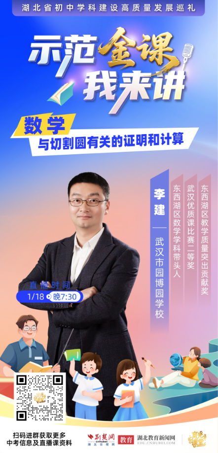 荆楚网(湖北日报网)讯(记者齐一璇)1月18日(本周日)晚7:30分,在“示范金课我来讲——湖北省初中学科建设高质量发展巡礼”活动中,武汉市园博园学校数学教师李建将带来“与切割圆有关的证明和计算”数学示范课直播,助力学子掌握解题关键。