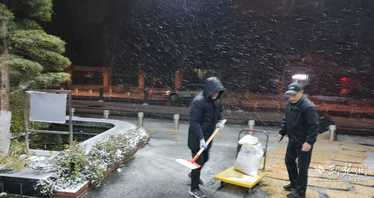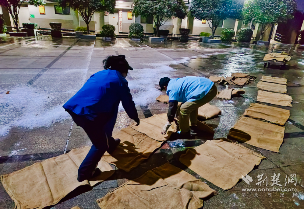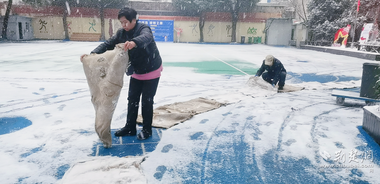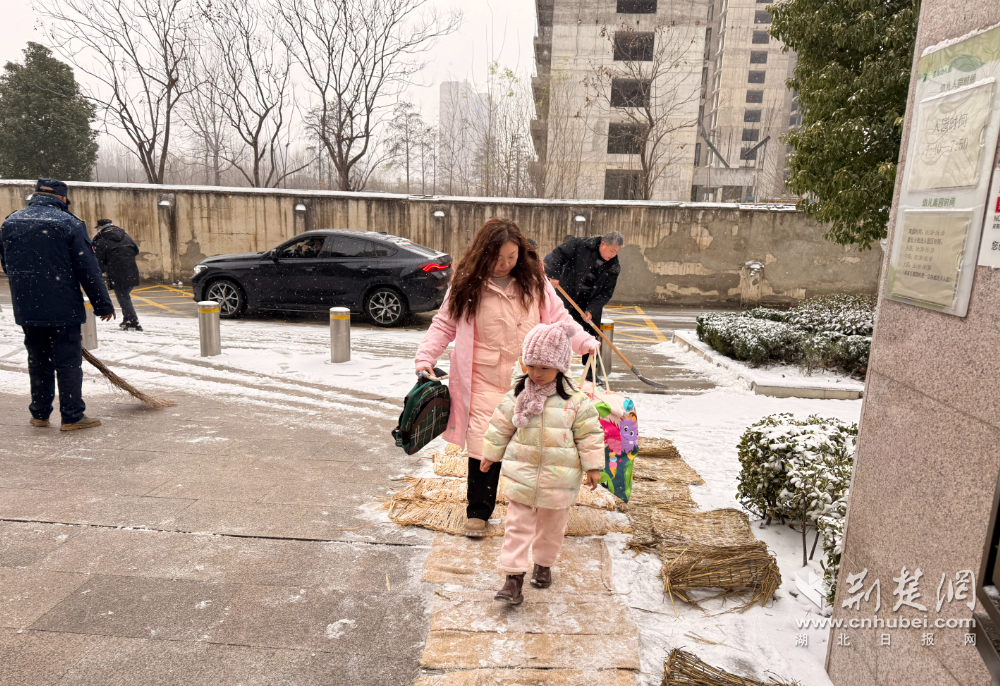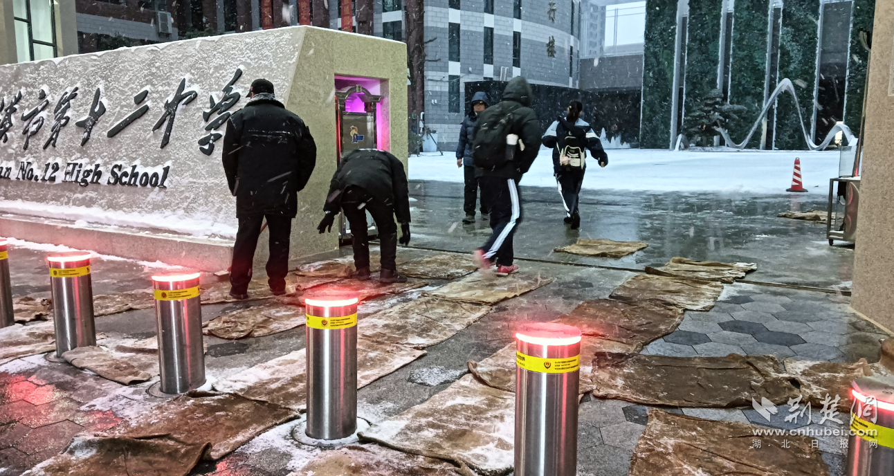 清晨6时许,武汉市第十二中学校园安保、后勤等工作人员已全员到岗,在入校通道、教学楼出入口铺设防滑草垫,并对积雪路段进行清扫。