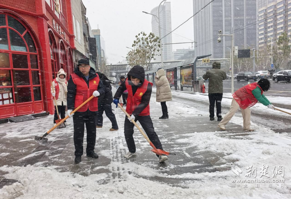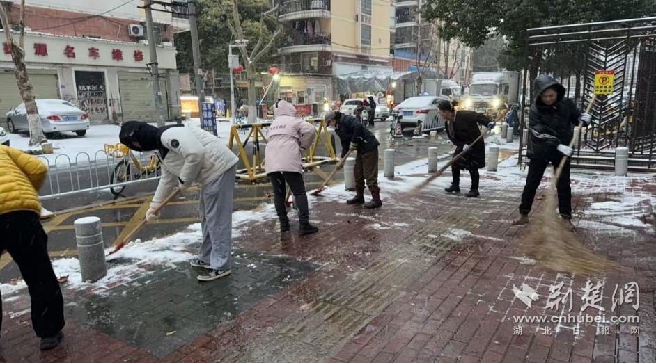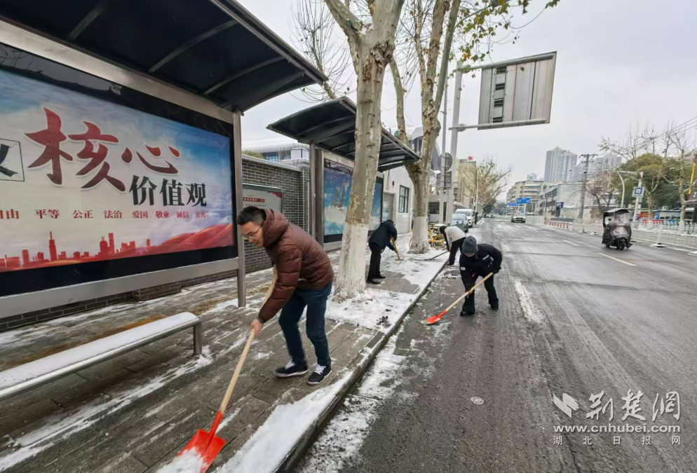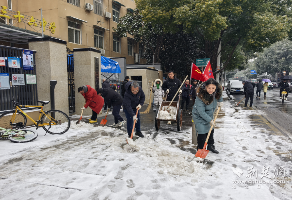 早上8点多,武汉市第一中学校领导带队,走上街头,开展铲雪除冰行动,保障师生及周边群众出行通畅。