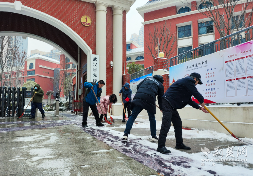 为保障学生上下学安全,武汉市先锋中学对校门口至教学楼的核心通道展开集中清扫。大家顶风冒雪、不畏严寒、分工明确、协作有序,奋力铲除路面冰层。