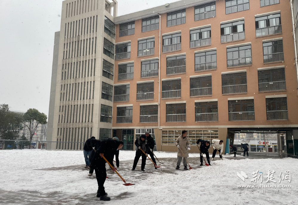 今日的大雪为武汉市第三十六中学披上洁白盛装,也给师生出行带来不便。学校党员干部闻雪而动、冲锋在前,手持铁锹扫帚,在教学楼通道、操场、校门口等重点区域分工协作,铲积雪、除薄冰。