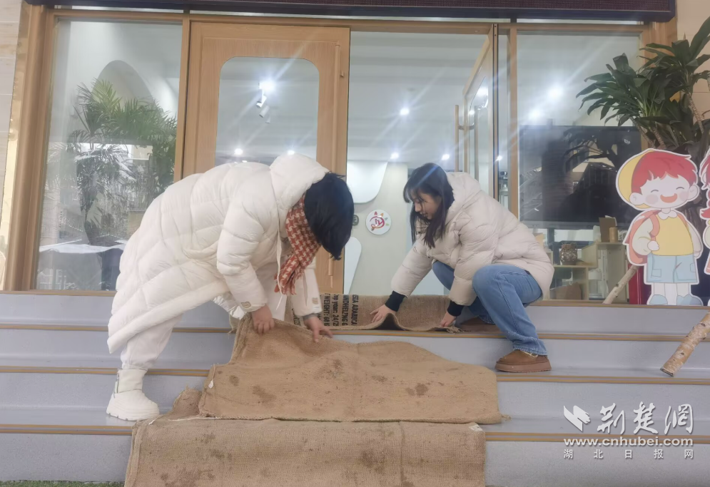 大雪纷飞,江汉区芸尚幼儿园门厅前,安保人员与家长志愿者冒雪加固雨棚、铺设防滑毯,用行动为孩子们筑牢安全上学通道,温暖护航每一步。