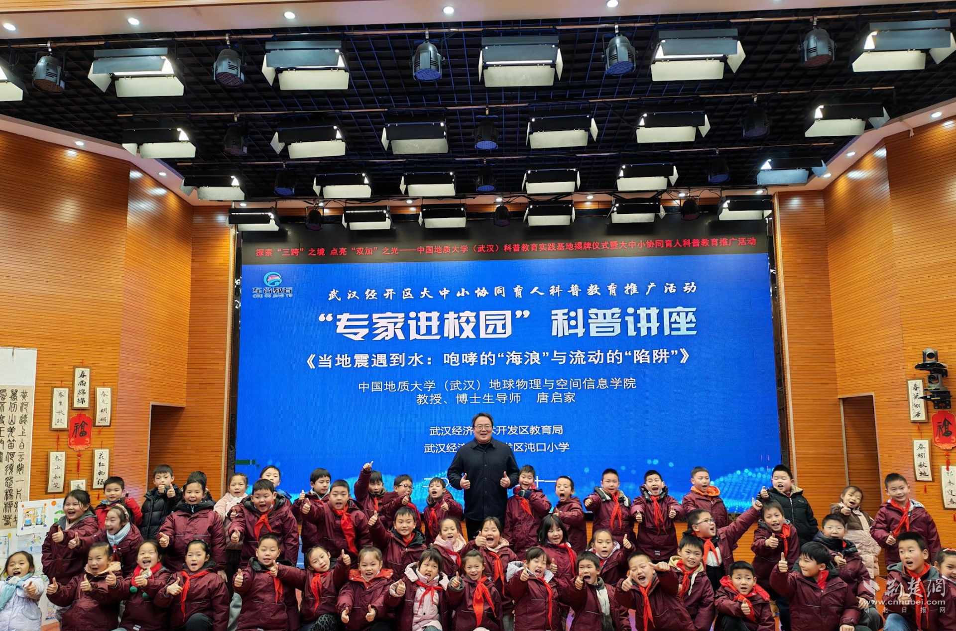 揭牌仪式后,高校专家团队分赴经开一中、经开二中、神龙小学及沌口小学四个分会场开展科普讲座。在沌口小学分会场,唐启家教授以《当地震遇到水》为题授课。四年级学生雷梓墨课后表示:“唐教授用生活中的例子讲清楚了深奥的原理,让我觉得科学既神秘又真实,好像自己也当了一回‘地质侦探’。”