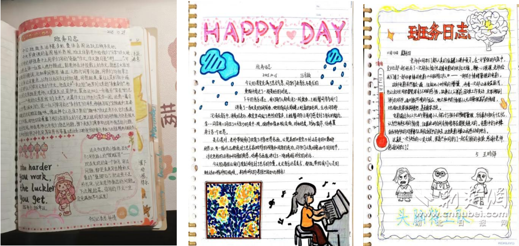 如今,这本手绘班务日志已成为班级的“精神纽带”。每天课间翻阅日志、交流创作思路,成为同学们最期待的日常。