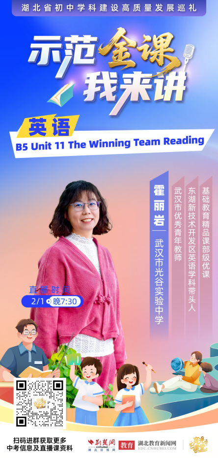 荆楚网(湖北日报网)讯(记者齐一璇、许文秀)2月1日晚,在“示范金课我来讲——湖北省初中学科建设高质量发展巡礼”活动中,武汉市光谷实验中学霍丽岩老师执教的英语阅读课例“B5 Unit 11 The Winning Team Reading”受到广泛关注。她以其独特的阅读教学法,为师生们解锁了英语阅读与情感教育融合的新路径。